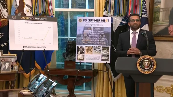 President Donald Trump was joined by FBI Director Kash Patel in the Oval Office as he read the score on the agency’s successful efforts to combat crime in major cities across the United States.